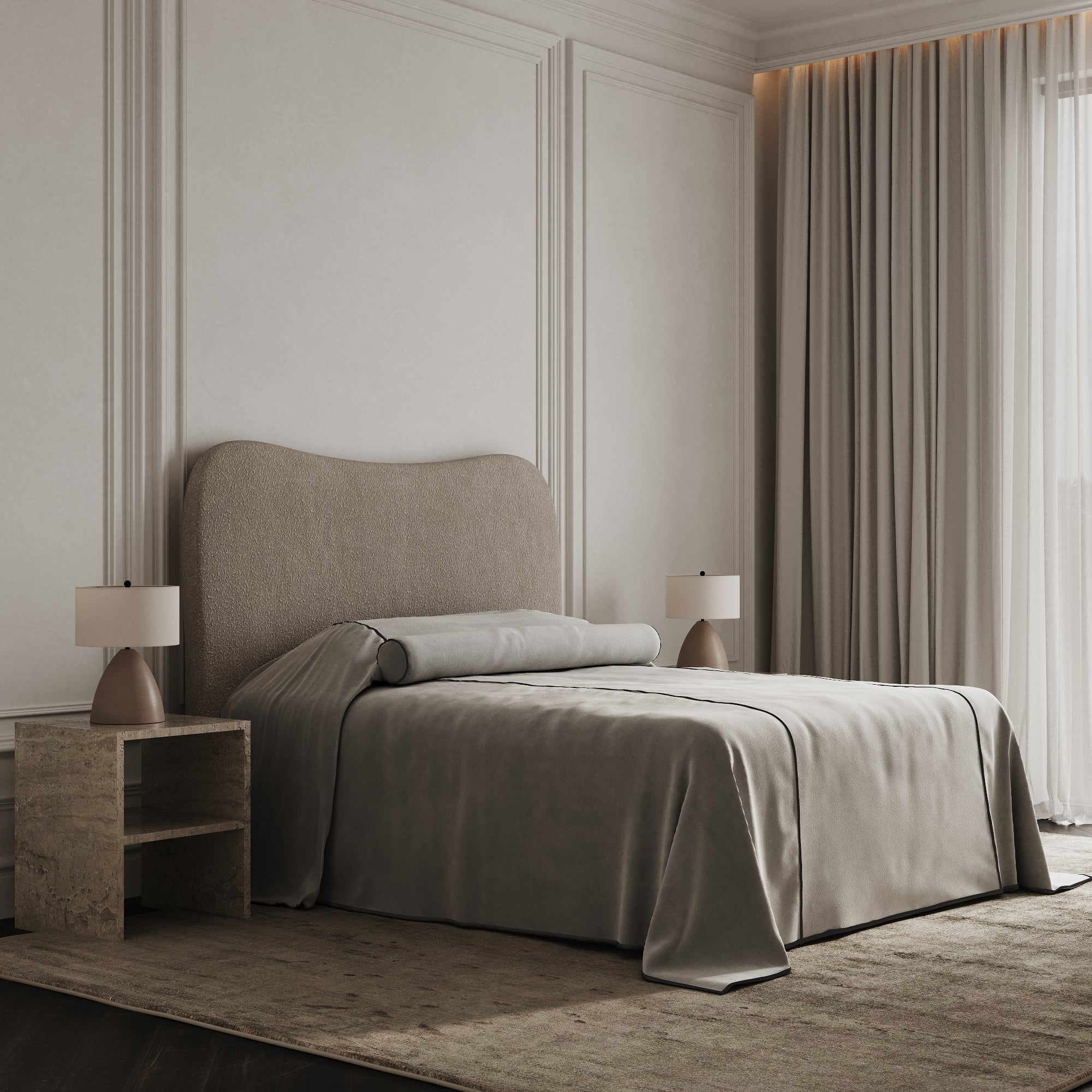 Available in a carefully curated selection of luxurious fabrics and tones—from versatile neutrals to rich, tactile hues—this headboard can be customised to perfectly complement your space. The plush upholstery ensures both comfort and durability, making it a standout feature that enhances your bed’s aesthetic.