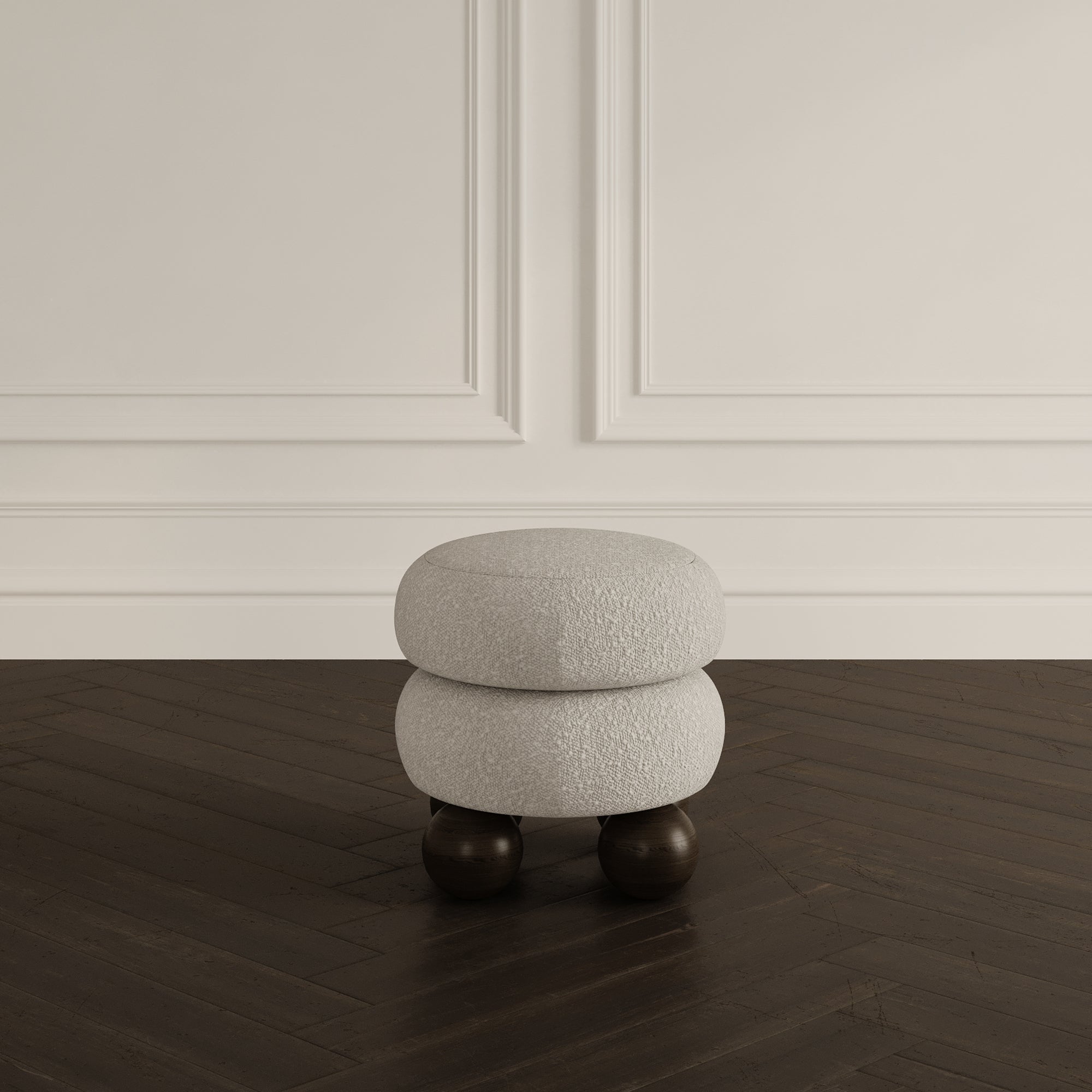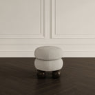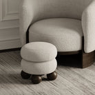 Playful yet sophisticated, the Hulu Upholstered Footstool brings a sculptural element to your living space. Featuring two plush, rounded cushions stacked for a bold, layered look and supported by smooth, spherical wooden legs, this piece is both artistic and functional.