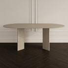 The Art Deco architectural style is evident in The Luna Dining Table, which features strong angles and geometric designs. It has a powerful and versatile appeal because to its sleek circular design and modern angular "V" shaped bases. In addition to being more aesthetically pleasing, the oval shape works well in small areas.