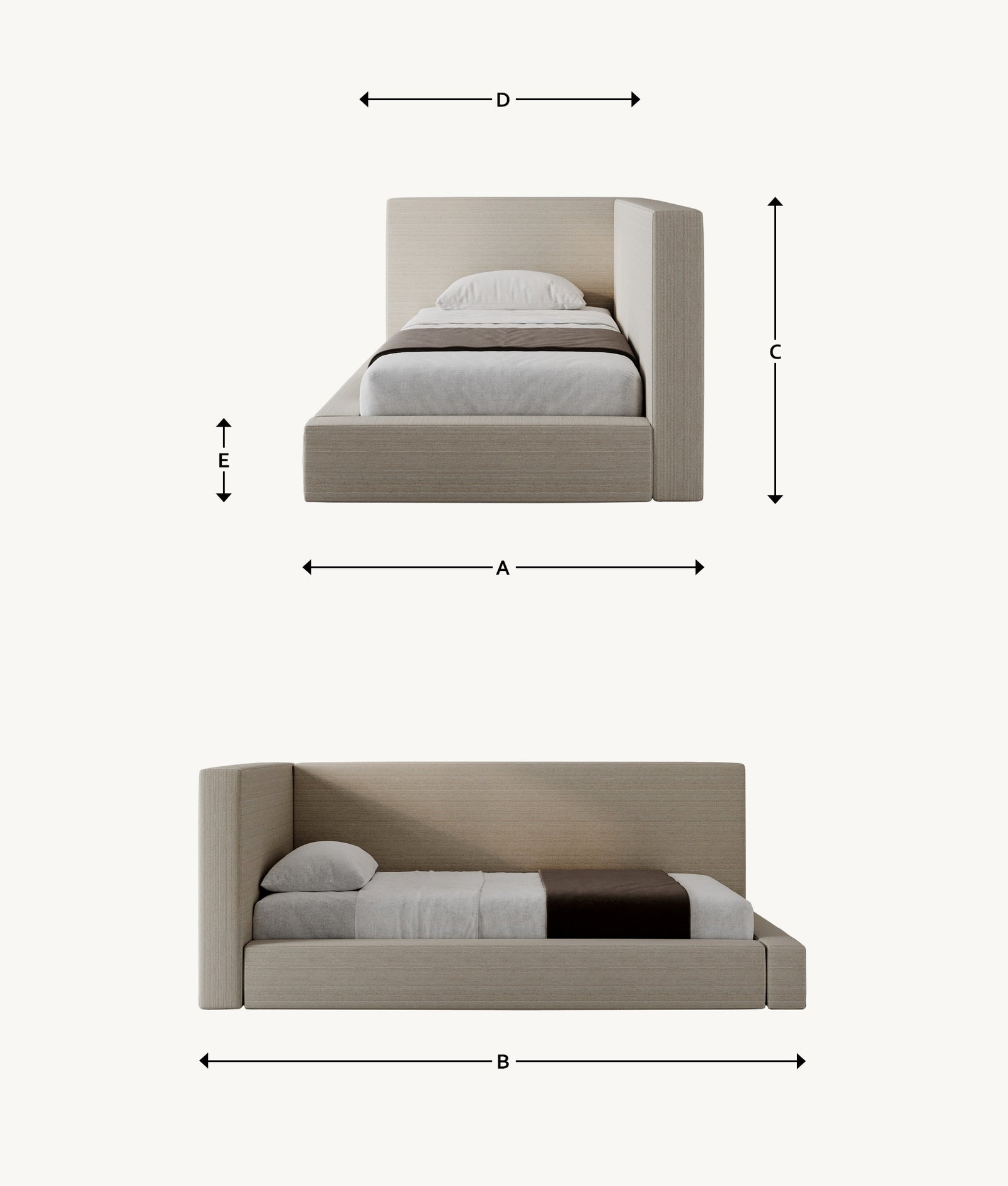 This children's bed is a perfect blend of modern design and cozy functionality, featuring a clean-lined, upholstered frame with a built-in corner headboard for a snug, cocoon-like feel. The neutral tones and soft textures make it both stylish and inviting, while the design promotes comfort and security—ideal for restful nights and playful days.