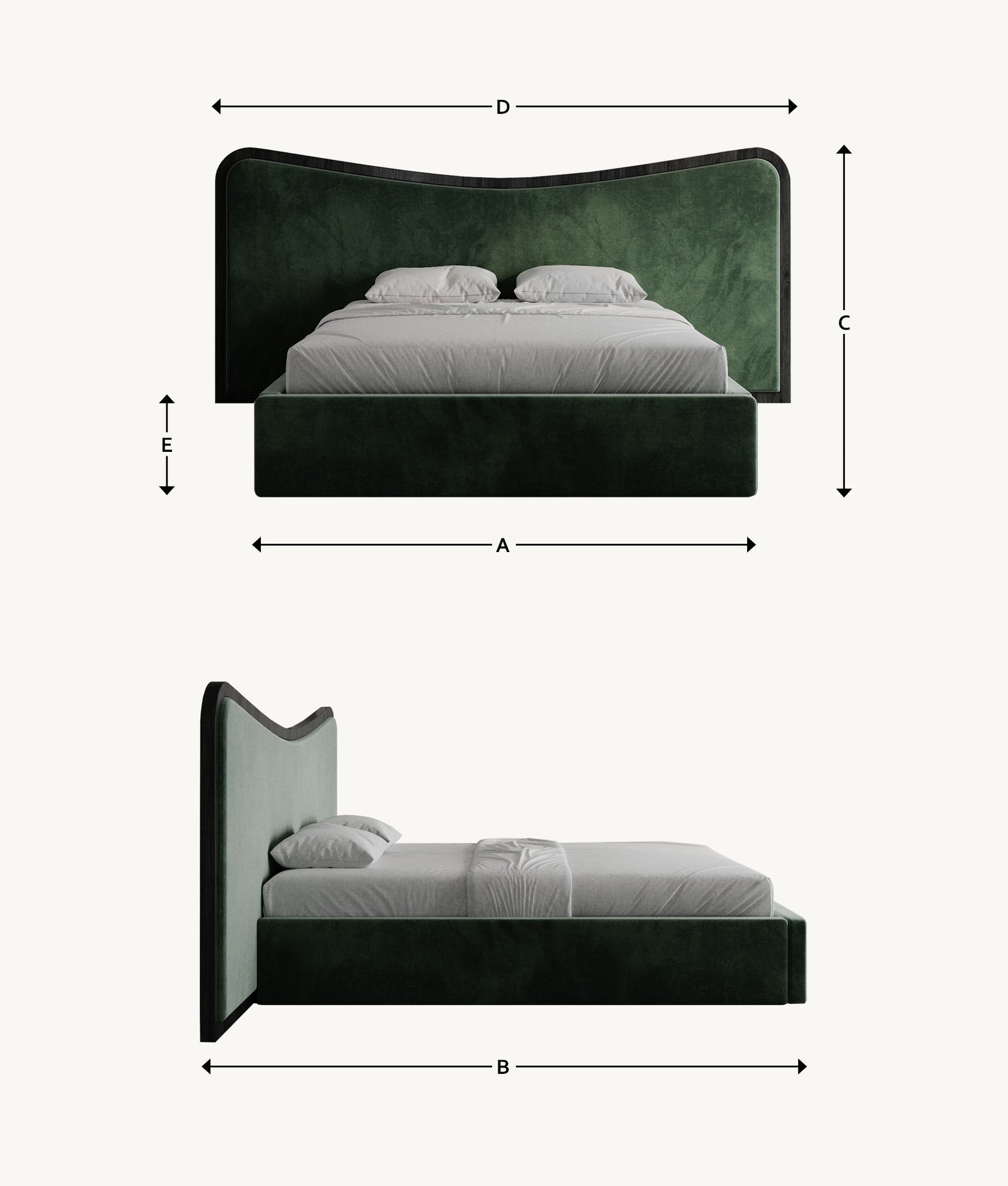 The Orion Bed redefines modern elegance with its distinctive asymmetrical headboard and rich, upholstered finish. The deep green velvet fabric adds a bold yet sophisticated statement, while the curved, dark wood frame provides contrast and structure. Designed for those who appreciate artistic form and luxurious comfort, the Orion Bed seamlessly blends contemporary style with timeless craftsmanship. Its plush, fully upholstered frame ensures a cozy retreat, making it the perfect centerpiece for a refined and distinctive bedroom.