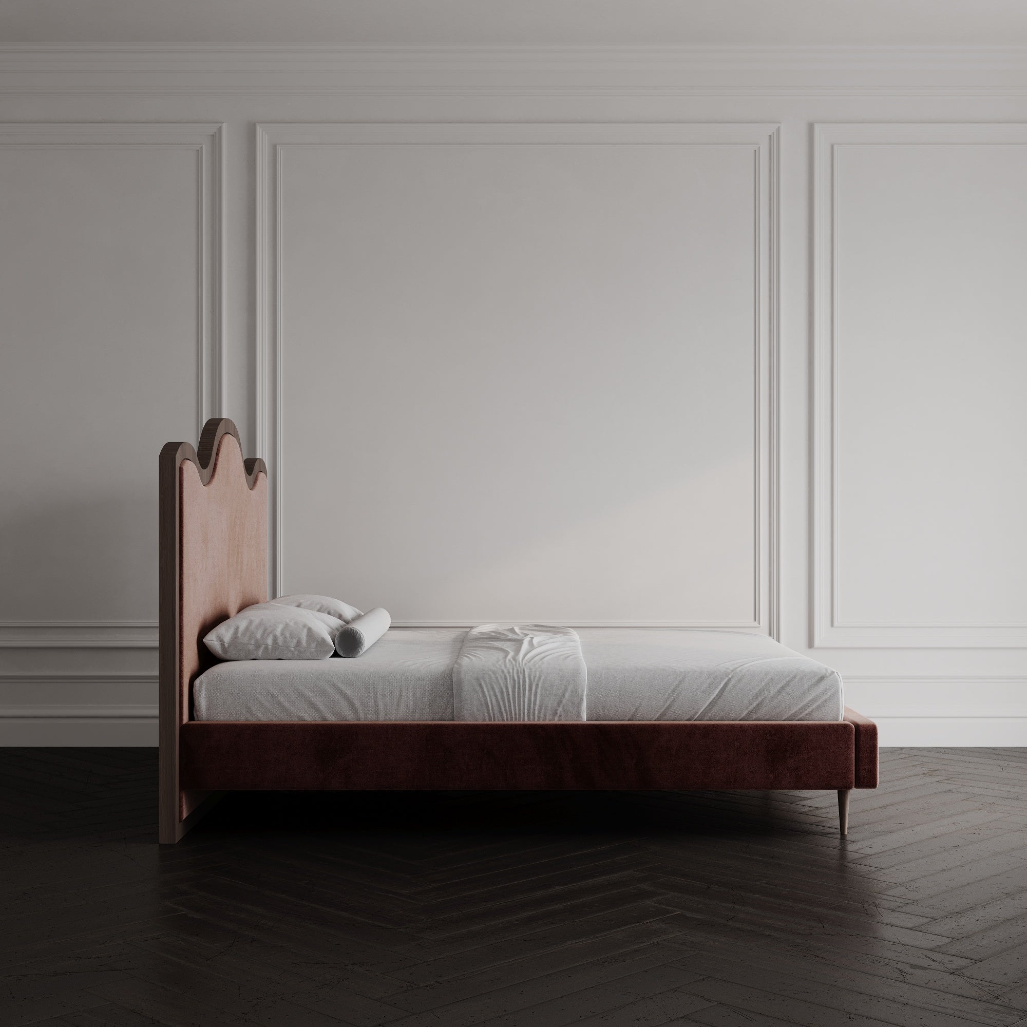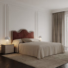 The Saville Bed exudes timeless sophistication with its gracefully curved headboard and rich, upholstered finish. The sculpted silhouette brings a touch of classic refinement, while the deep-toned fabric adds warmth and depth to any space. Designed to be both a statement piece and a retreat, the Saville Bed seamlessly balances traditional charm with modern simplicity. Its plush, fully upholstered frame enhances comfort, making it the perfect choice for those who appreciate luxury and craftsmanship in their bedroom.